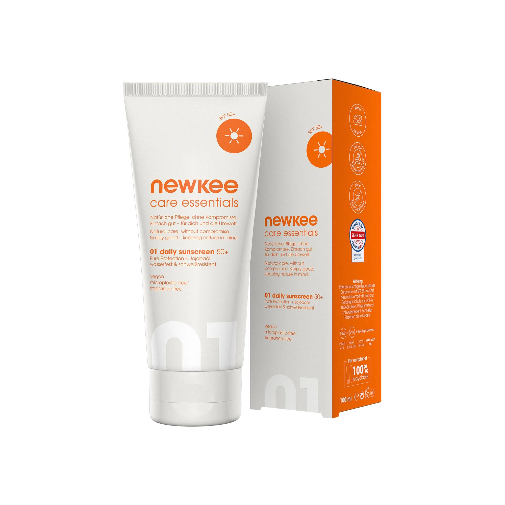 Con newkee daily sunscreen 50+, la vostra pelle è protetta a 360° e meravigliosamente curata: La nostra protezione solare vegana con Fattore di protezione 50+ è impermeabile e resistente al sudore, quindi completamente privo di siliconi, parabeni e profumi. La L-carnosina, inoltre, rallenta l’invecchiamento cutaneo e protegge dai danni della luce blu.