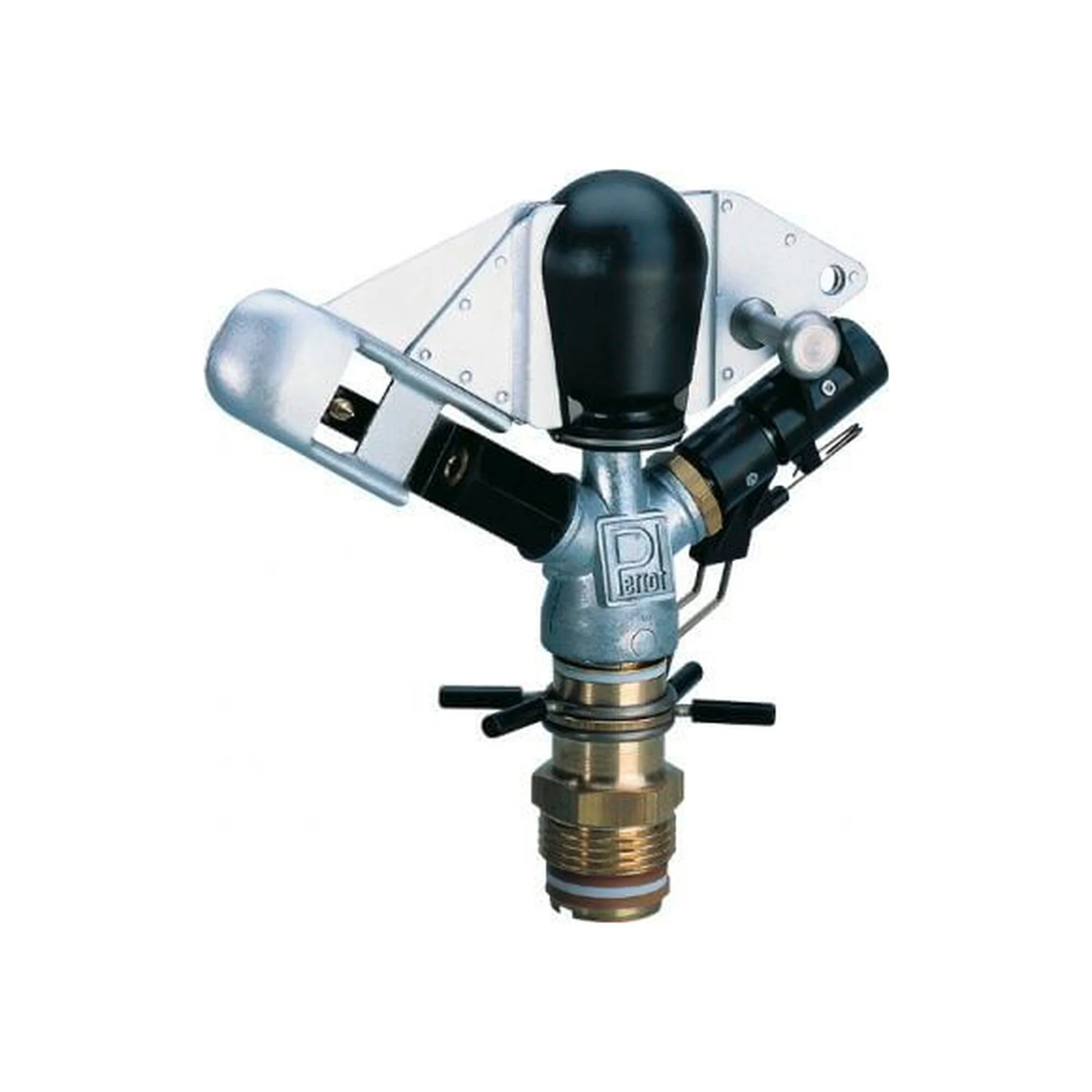 Irrigatore a leva oscillante a 1 ugello di comprovata efficacia con getto ascendente di 30° e ugello propulsore di 5 mm, compreso il rompigetto per variare il getto d’acqua.